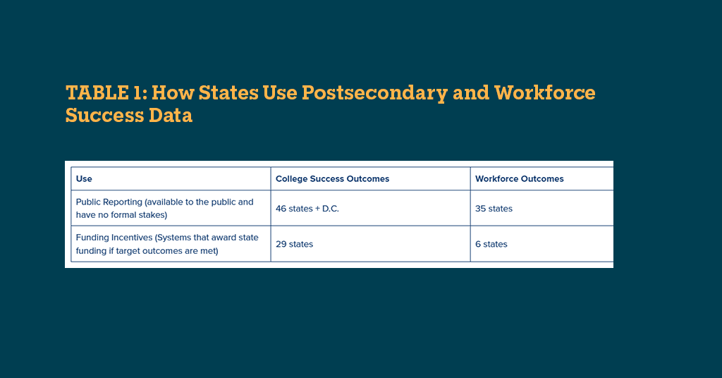 Although federal laws don’t yet require higher education accountability systems, the report found that the majority of states track and use data for public reporting and in funding incentives. (See Table 1).