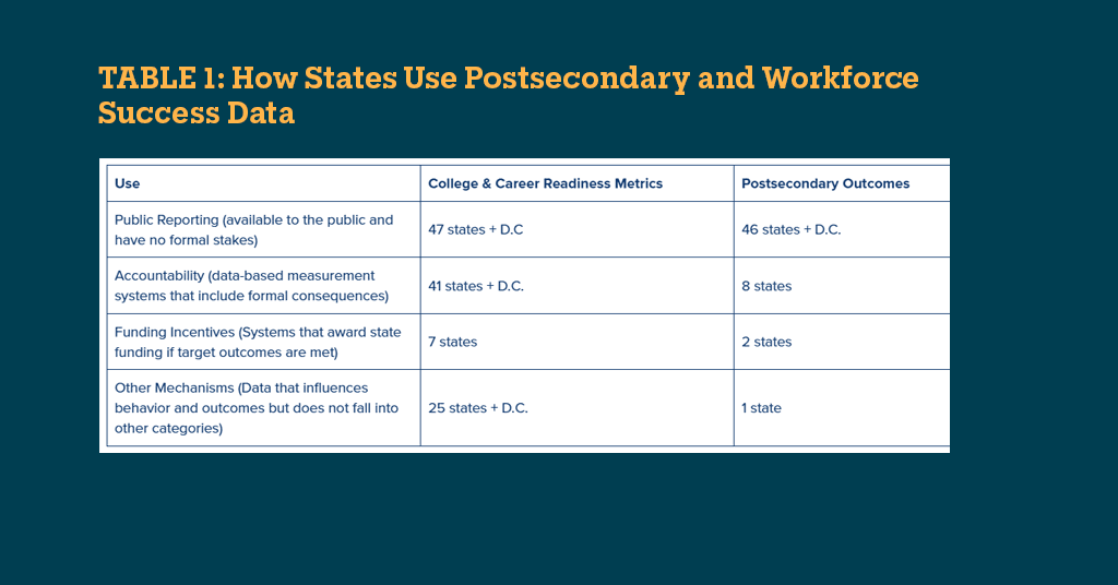 States use Student Success Outcome data in a variety of ways (see Table 1), with the most common being public reporting. While all states share some College and Career Readiness Metrics or Postsecondary Outcomes publicly (43 states + D.C. report both, 4 states report only College and Career Readiness Metrics, and 3 states report only Postsecondary Outcomes), the information is not always easy to find.